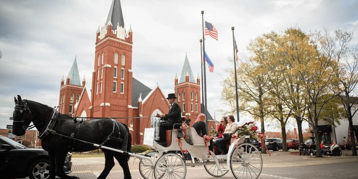 Step into the story this Christmas with a private carriage ride through Historic Downtown Fayetteville. Each carriage offers a cozy, candlelit journey through the glow of A Dickens Holiday — complete with warm blankets, gentle music, and the rhythmic clip-clop of horses on brick streets. Whether you choose the classic elegance of The Marquis, the quiet joy of The Jubilee, or the fairytale sparkle of The Campbellton, every ride is yours alone — a private, unforgettable chapter in the story of Christmas downtown.